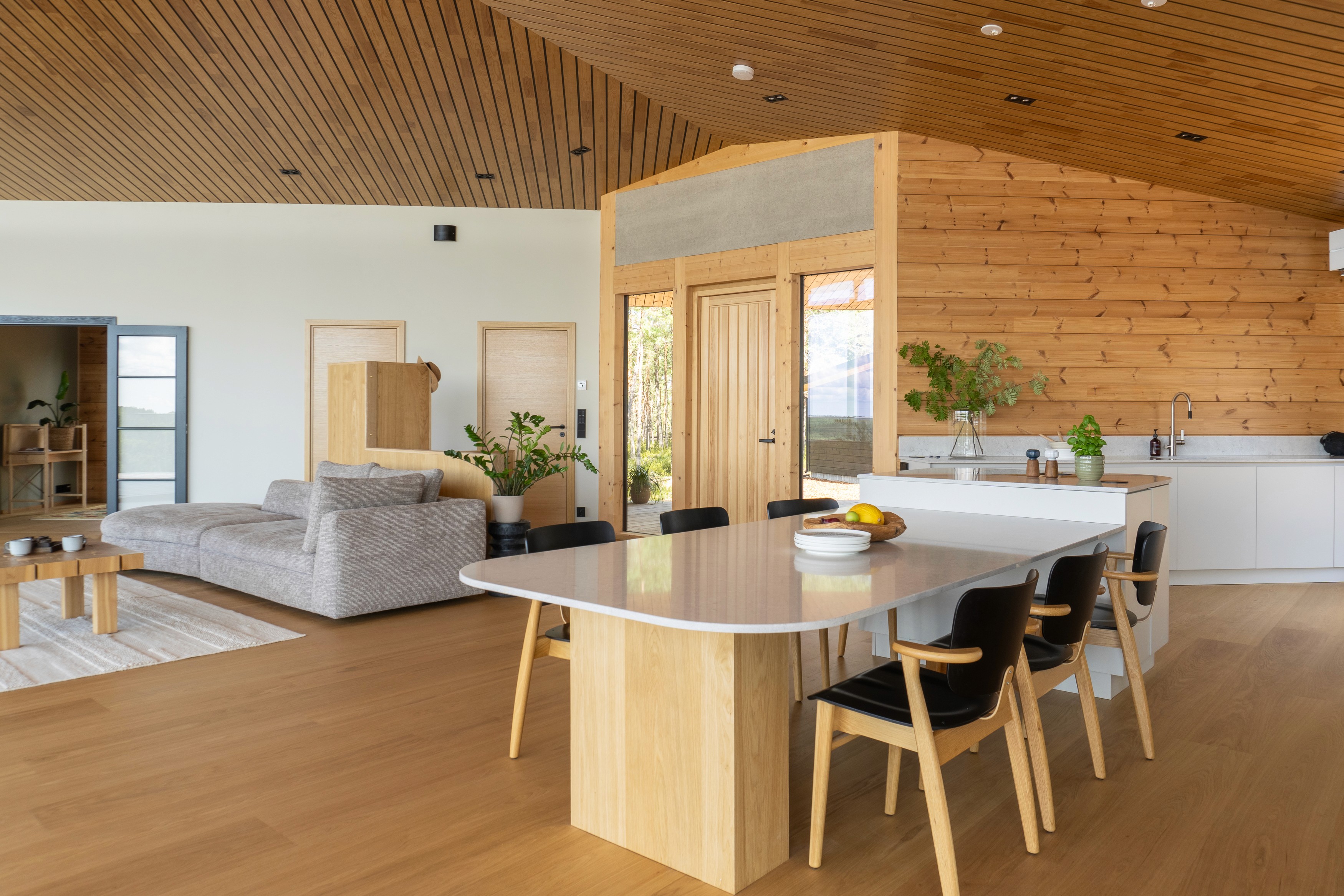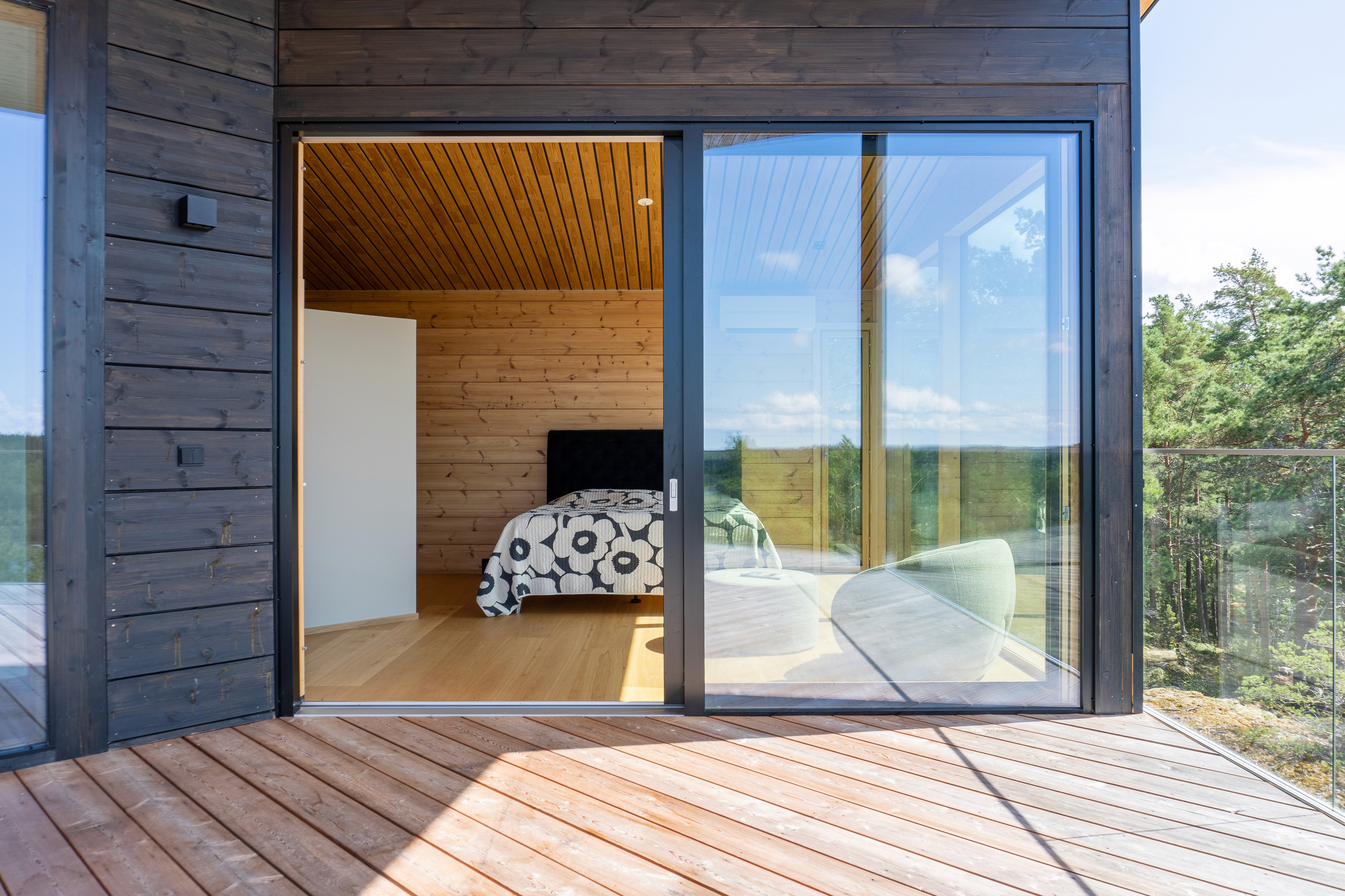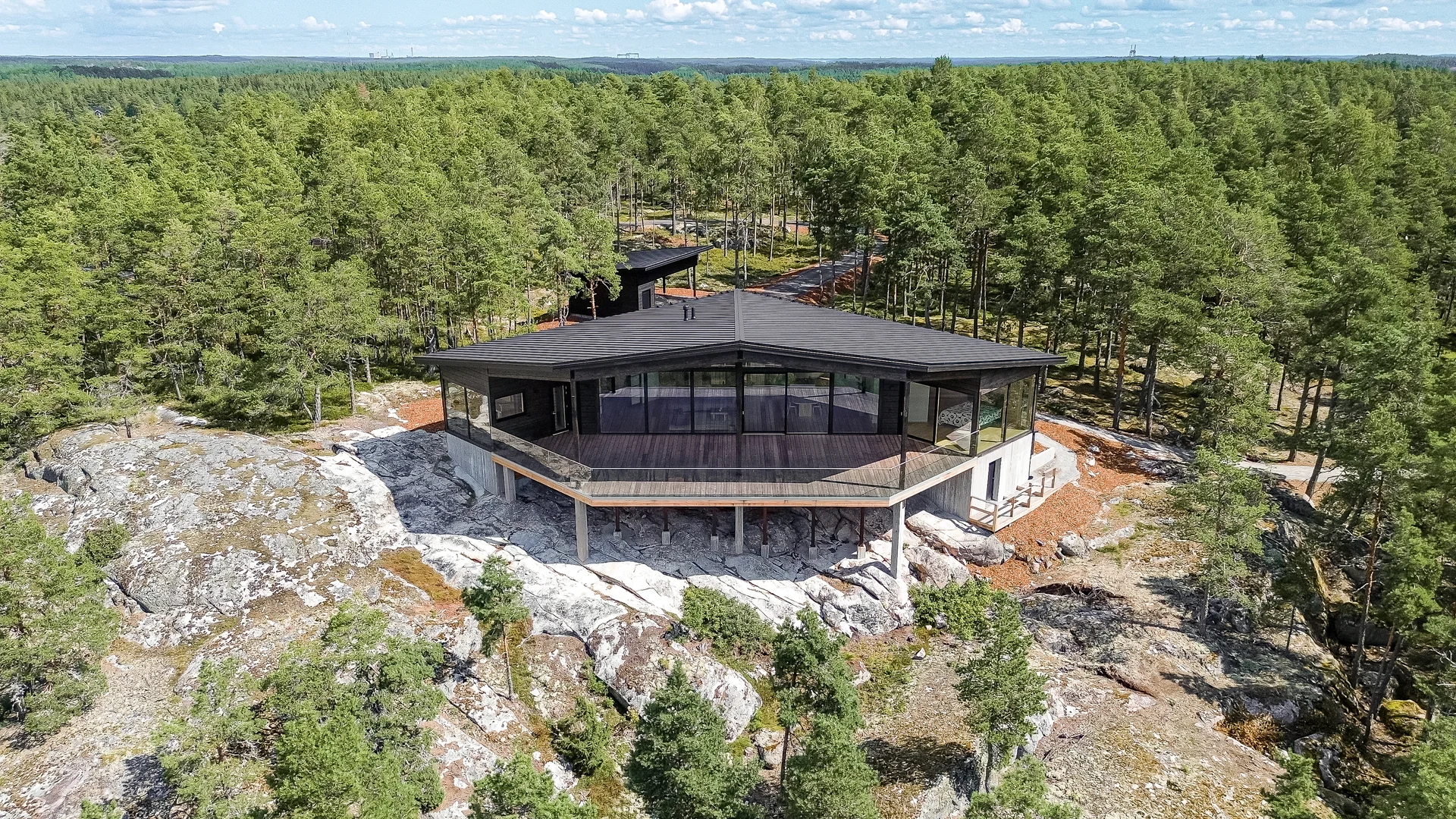 The route leading to the home is a journey in itself—through rocky terrain, over bridges, past charming marinas and traditional coastal homes, with archipelago pines and junipers guiding the way. Winding through the scenic roads to Nuikonlahti and ascending to Vuorenranta, you’ll discover a tranquil haven where the dramatic rise of the land meets the calm of the sea. Set approximately 40 meters above sea level, the villa greets you with panoramic views that stretch across the horizon, giving an instant sense of escape and serenity.